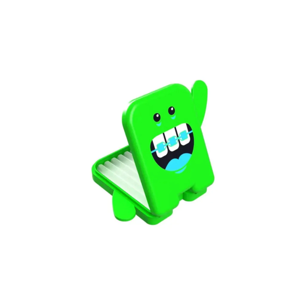 Além de proteger, aliviar e cuidar, a nossa cera ortodôntica tem cheirinho e gostinho de chiclete (tutti frutti) e ainda vem em uma linda caixinha com formato de dente, que depois pode virar porta pequenos objetos.