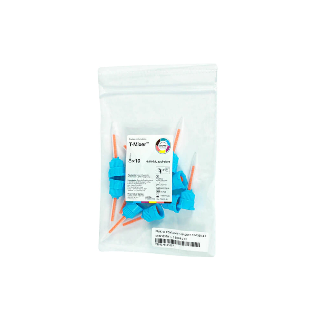. A Ponta misturadora MIXPAC T-Mixer que possui sua base na cor azul, com o elemento de mistura laranja, é indicada para resinas Bisacrílicas e Silicone de Modelo.