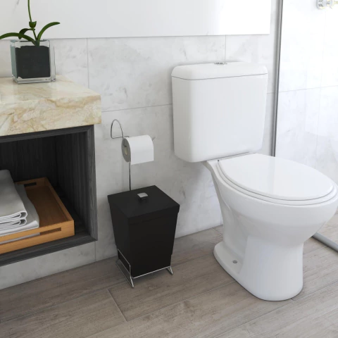 Ideal para pequenos espaços, não precisando de montagem para o seu uso. Lixeira ampla, com 6,5L de capacidade, acompanha anel em metal para fixar a sacola de lixo. Informações Adicionais: - Material: Polipropileno e aço cromado - Capacidade da Lixeira: 6,5 Litros - Não utilizar esponjas abrasivas para limpar a lixeira, somente uma esponja macia - Não utilizar produtos químicos para a limpeza da lixeira, utilizar somente água e detergentes neutros. Dimensões: - Altura Lixeira: 24 cm - Altura com Suporte: 58 cm - Comprimento: 20 cm - Largura: 20 cm Itens inclusos: - 01 Lixeira Banheiro Com Suporte Papel Higiênico