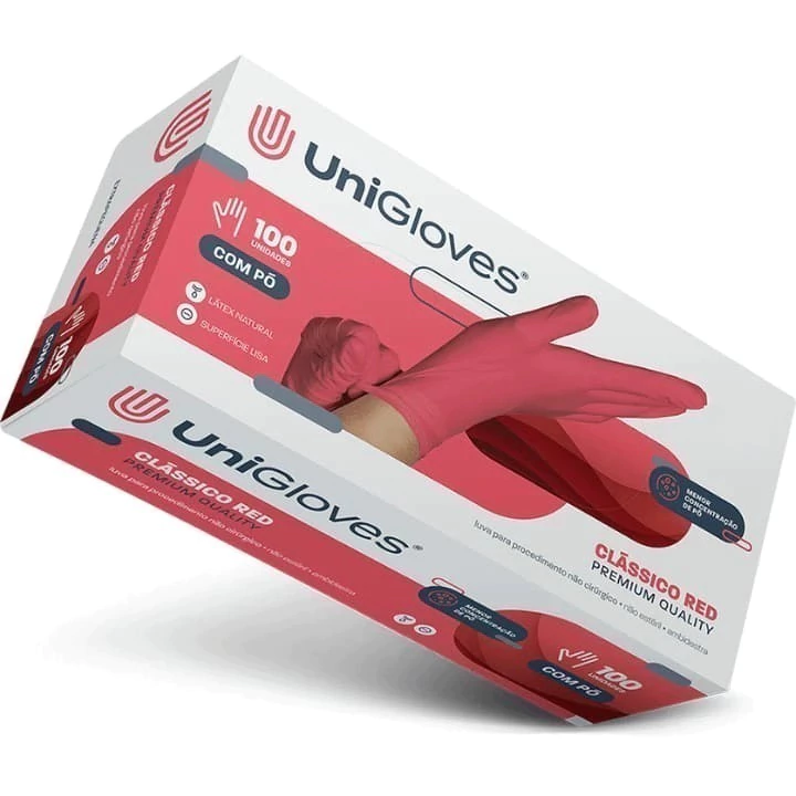 Luva de Látex Clássicos Colors UniGloves LUVA DESCARTÁVEL PREMIUM PARA PROCEDIMENTO NÃO CIRÚRGICO Proteção e Conforto Superior Feitas com látex de borracha natural, as luvas Clássico UniGloves estão disponíveis em 9 cores vibrantes, oferecendo excelente sensibilidade tátil e alta proteção contra contaminações. Com leve pulverização de amido de milho bioabsorvível, facilitam o calçamento e remoção sem ressecar as mãos. Menos Pó, Mais Qualidade As luvas Clássico UniGloves têm uma menor concentração de pó, assegurando maior conforto e qualidade. Benefícios: - Látex 100% Natural: Reduz resposta alérgica do tipo I. - Superfície Lisa: Maior aderência e precisão. - Variedade de Cores: Disponível em 9 cores vibrantes para personalizar seu estilo e melhorar a gestão. - Ergonomia: Reduz fadiga muscular, ajuste perfeito. - Maior Espessura: Alta resistência a rasgos. - Punho Alongado: Previne entrada de líquidos, fácil calçamento. - Barreira Biológica: Proteção contra microrganismos e vírus. - Escolha UniGloves® para proteção e conforto superiores. Características e especificações: Marca: UNIGLOVES Modelo: Clássico Colors Formato de venda: Caixa Unidades por pacote: 100 Material: Látex, Nitrílica Com pó: Sim É estéril: Não C.A: 41.033